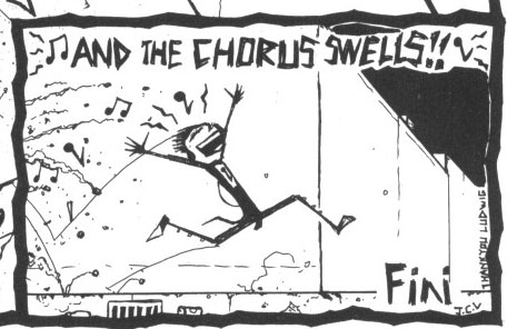 The second half of the book features Vasquez’s filler strips – one or two-page stories of pain, heartbreak and horror. Poor Wobbly-Headed Bob tries to convince the rest of the world to accept that he’s smarter than they are, and can’t understand why they want to kill him. True Tales of Human Drama are just that – dramatic, probably human and god I hope they’re not true. Happy Noodle Boy is a free-form anarchistic story, allegedly drawn by Johnny himself, and I can never manage to finish one. My favorite filler strips are the Meanwhile…. strips, one of which features two elementary-school crossing guard children enacting the final battle between two entities of pure evil. Another depicts a first date gone horribly, horribly awry as a case of gastrointestinal distress engenders one of the best attempts to save face I’ve ever seen. A horrible, lying vampire, the revenge of the pinatas, and a case of childhood attachment issues gone horribly wrong, these are some of my favorite works in the whole series.